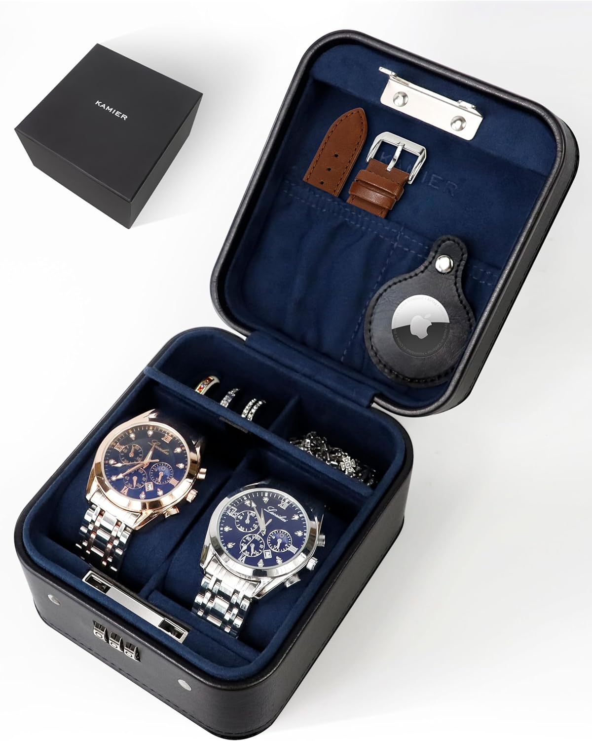 KAMIER Watch Travel Case with Combination Lock - 2 Watch Storage and Jewelry Organizer - Watch Case for Ring and Watch Sto...