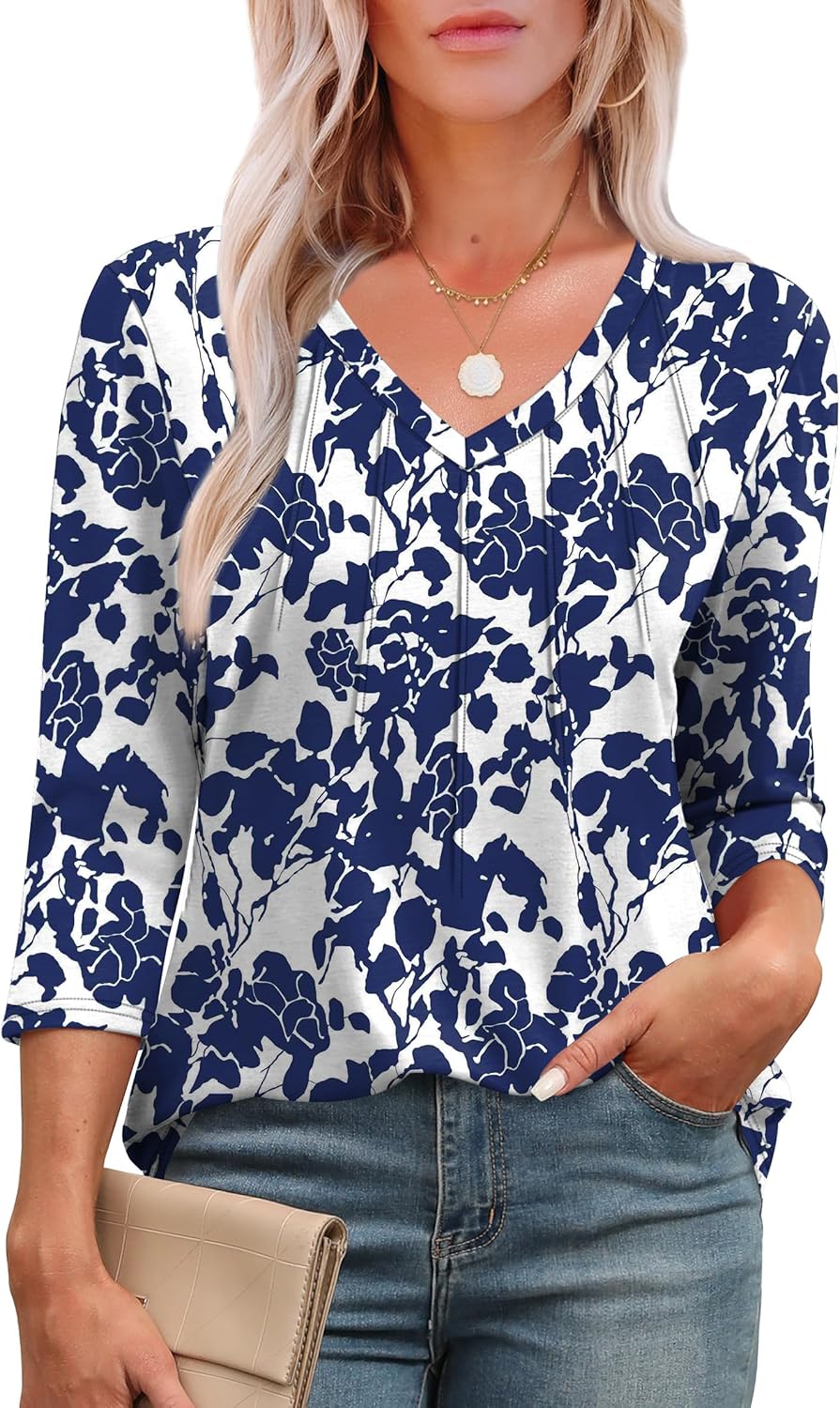 SAMPEEL 3/4 Length Sleeve Womens Tops Pleated V Neck Dressy Casual Blouses Summer Outfits Plus Size Spring Clothes