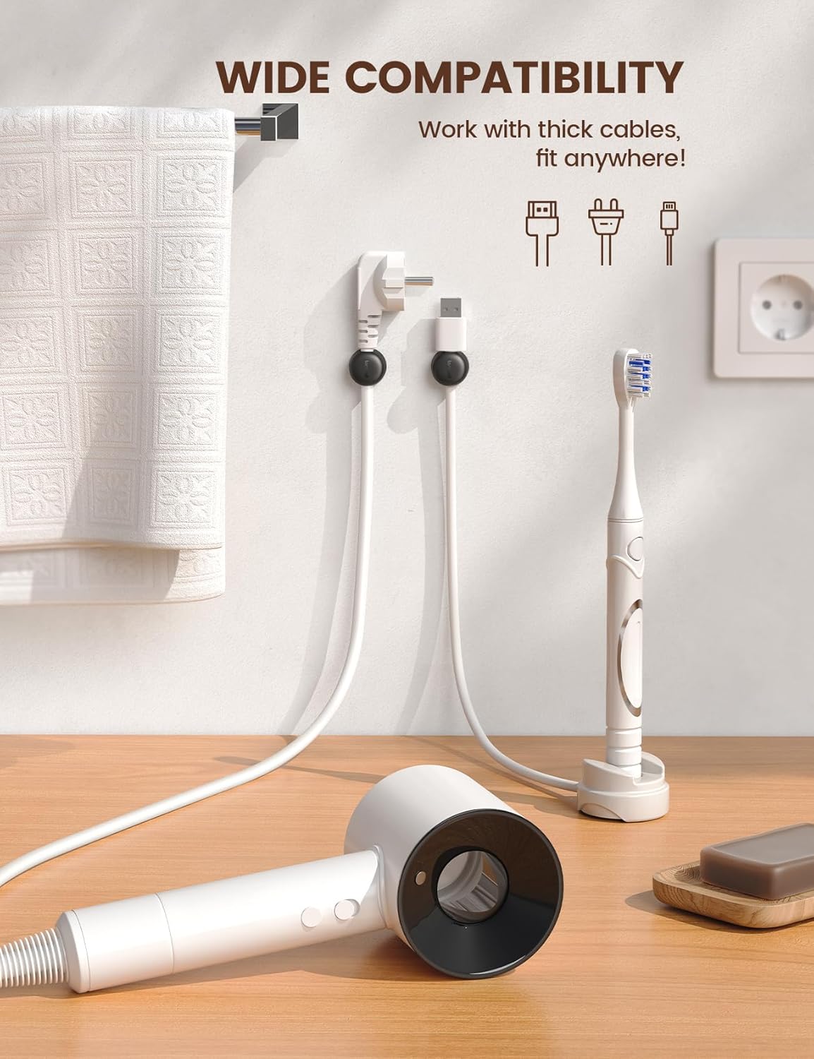 [Auto Close Spring Locking] Our cord holder clips are equipped with a spring open-close mechanism that combines a 60° rotation shaft and a thoughtfully angled opening. This cord holder organizer allow you to place and remove your phone charging cords, HDMI cords, household wires qucikly and securely - using just one hand! [Installaiton Tip] Please wait 30 minutes after sticking the cord holders to let the adhesive fully set