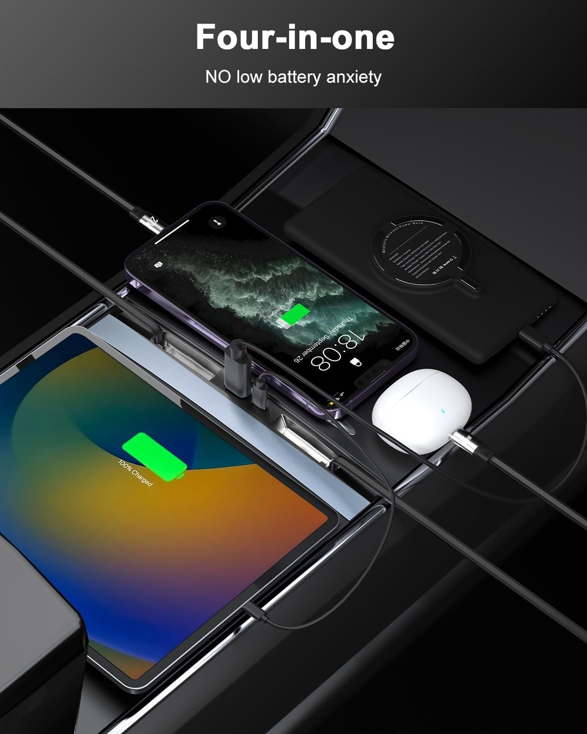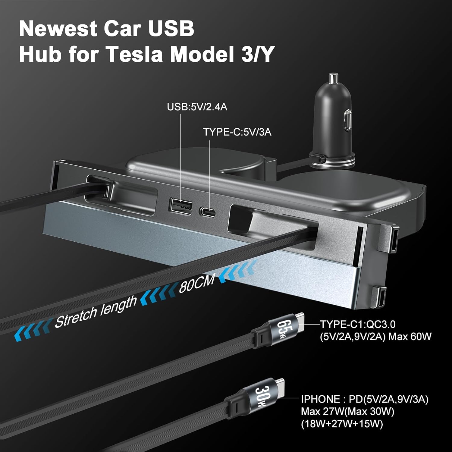 4 Ports for Fast Charging: LANSAN USB hub for Tesla Model 3/Y features 2 Type-C cable, free retractable up to 31.5inch. And 2 charging ports for USB and Type C.The charging cable is retractable, once you are done charging pull the cable back and it will retract back.It keeps everything clean and solves the problem of wires getting twisted. it is a great addition to your car.