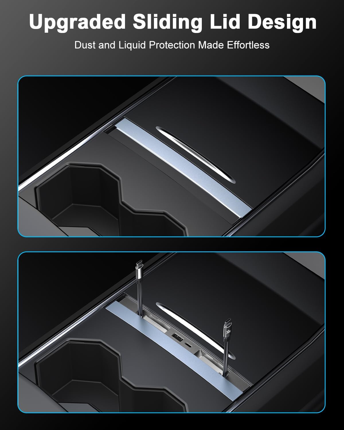 2024 Upgraded Tesla Charger: LANSAN Upgraded Tesla accessories adopt a waterproof Sliding Lid design to prevent liquid and dust particles from falling in. Extend the life of your Tesla Model 3(Highland)/Y(Juniper) 2024 accessories and keep them clean with ease!