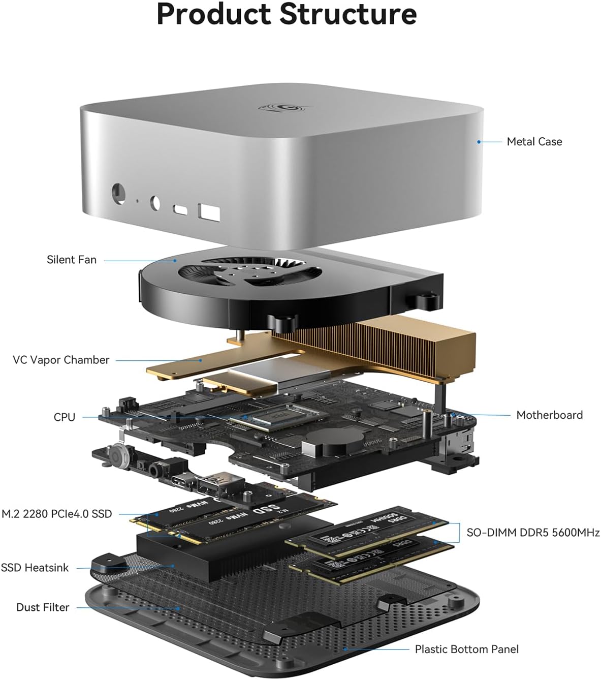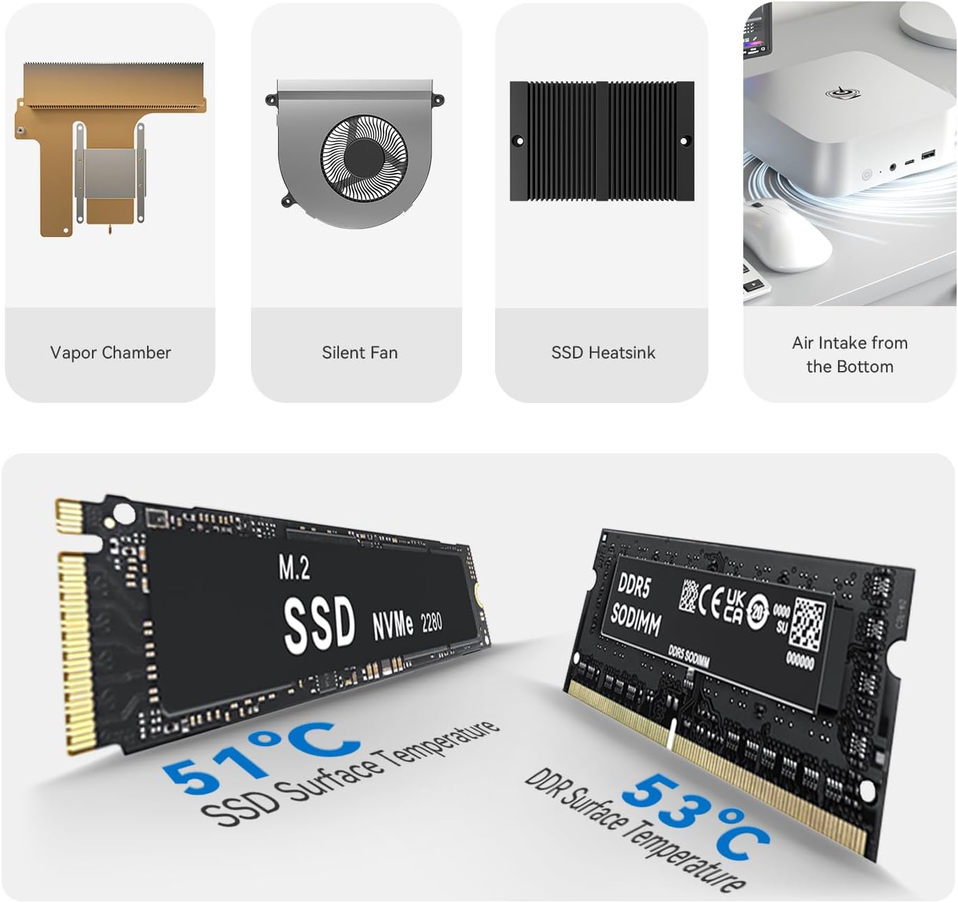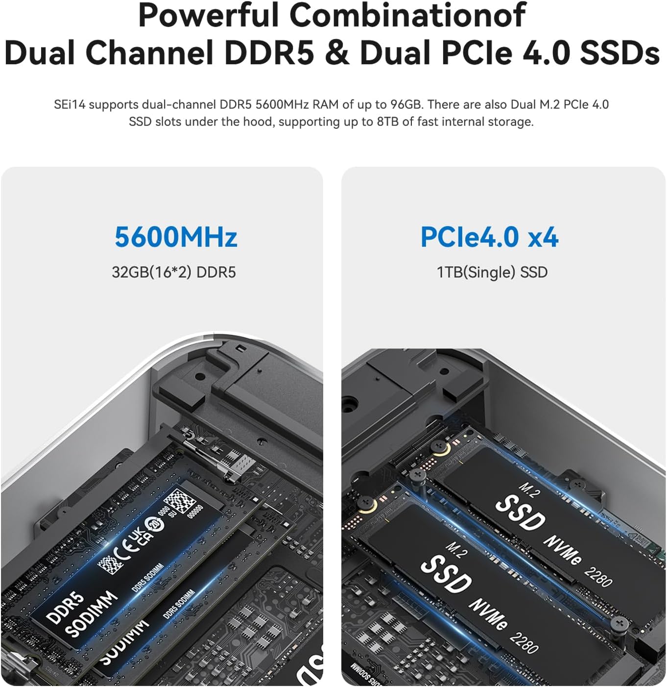 ??【External and Internal Storage Expansion Options】Beelink mini computer is equipped with 32GB DDR5 5600MHz internal Memory(Users can take initiative to upgrade up to 96GB).There are also Dual M.2 PCle 4.0 SSD slots under the hood, supporting up to 8TB of fast internal storage. Multitask working can be performed smoothly, and all your necessary software applications can be accommodated in this small machine!