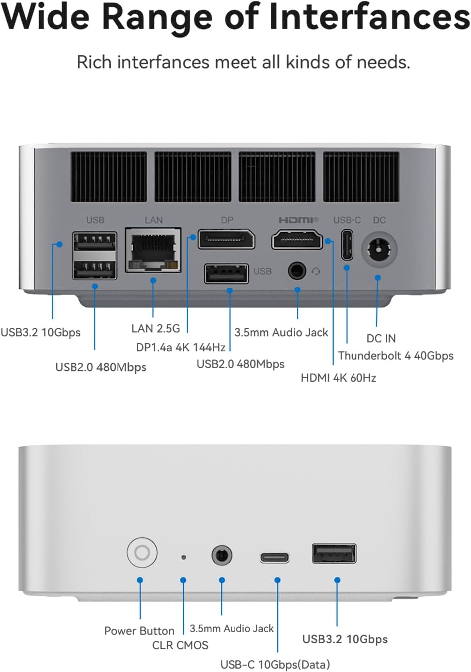 ??【More interfaces designed & Licensed W11 Pro Pre-installed】Mini Desktop PC Beelink SEI14 includes 2xUSB 3.2 10Gbps, 2xUSB 2.0 480Mbps, 1xHDMI, 1xDP1.4, 1xType-C(USB/DP1.4/TBT4/PD), 1xType-C(Data 10Gbps), 2xAudio Jack (HP&MIC), 1x 2.5G Gigabit Ethernet LAN (RJ-45 port), 1xDC Jack. Beelink Mini PC supports Linux OS, if necessary, you can install Ubuntu OS for programming development, building server, and learning database.