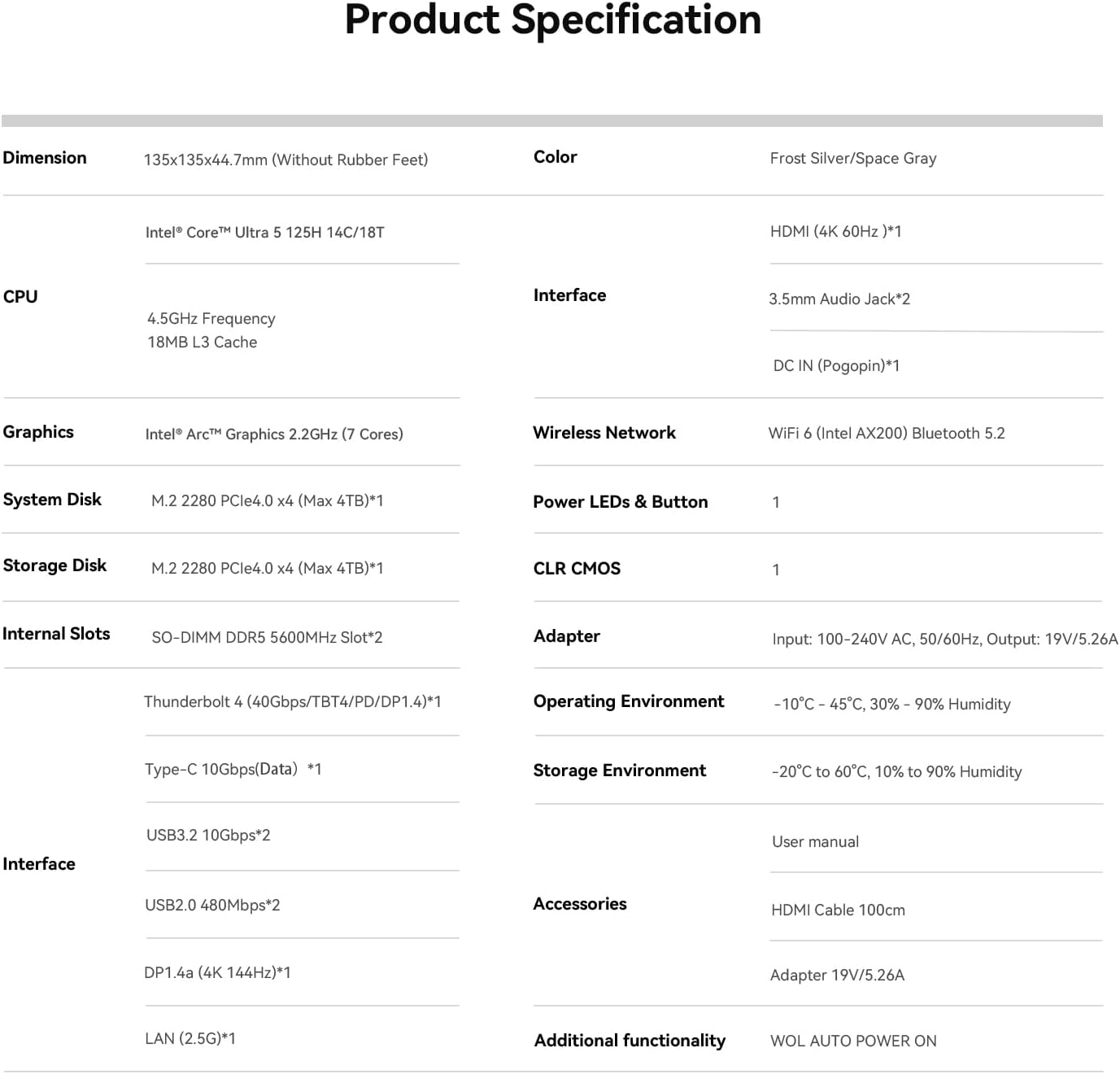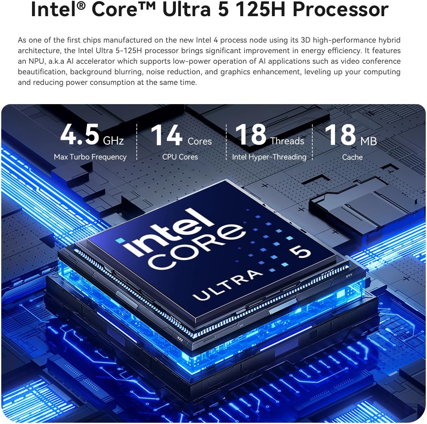 ??【The newest Intel AI CPU and User Friendly Design】Beelink mini pc equips with the newest Intel Core Ultra 5 125H(14-Core,18-Threads)18MB Intel Smart Cache, up to 4.5Ghz, which gives you the fastest and smoothest enjoyment, and is ideal for playing Plex Media Server, business and education. It also is User Friendly Design. The portable compact computer size and minimalist appearance, make your life away from chaos. Our whole machine is electricity cost saving.