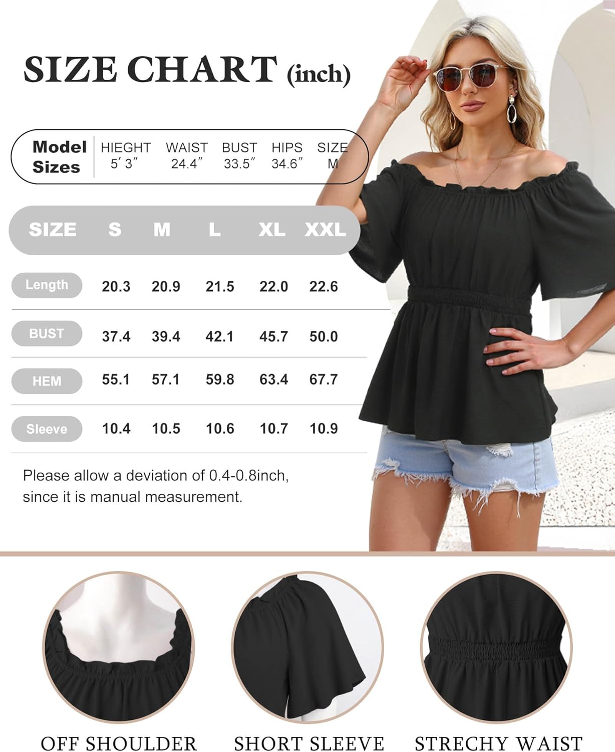 Off The Shoulder: You can wear this sexy cute summer blouses on or off the shoulders thats easy to adjust as it looks fabulous either way. It is the type of top you can dress up or dress down. This is a must have for your beach vacation