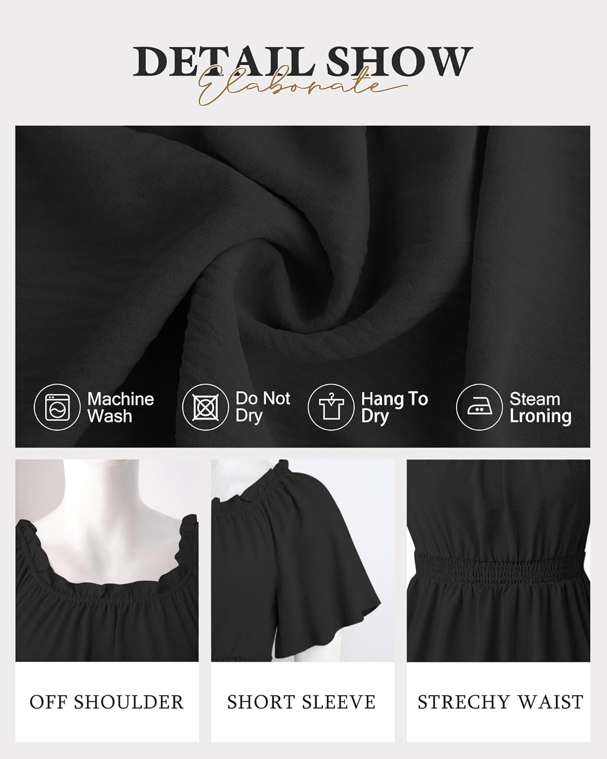 Elastic Ruffle Shoulder & Waist: The shoulder elastic is secure enough to stay put with movement, but has enough stretch that it doesn’t leave marks on your skin;the elastic band that helps give you a slim fit waistline,and the flares outward just a bit to cover up your tummy