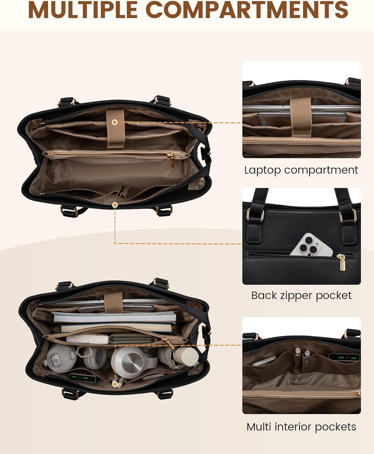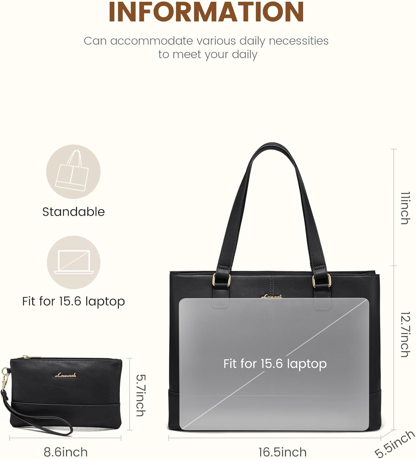 【Large Capacity Work Tote】 Size-16.5 x 5.5 x 12.7 inches, this women's tote offers a generous main compartment, a padded pocket for a 15.6-inch laptop, two slip pockets, and a zippered pocket. It's ideal for storing your iPad, documents, files, headphones, and more, keeping your essentials neatly organized and within reach.