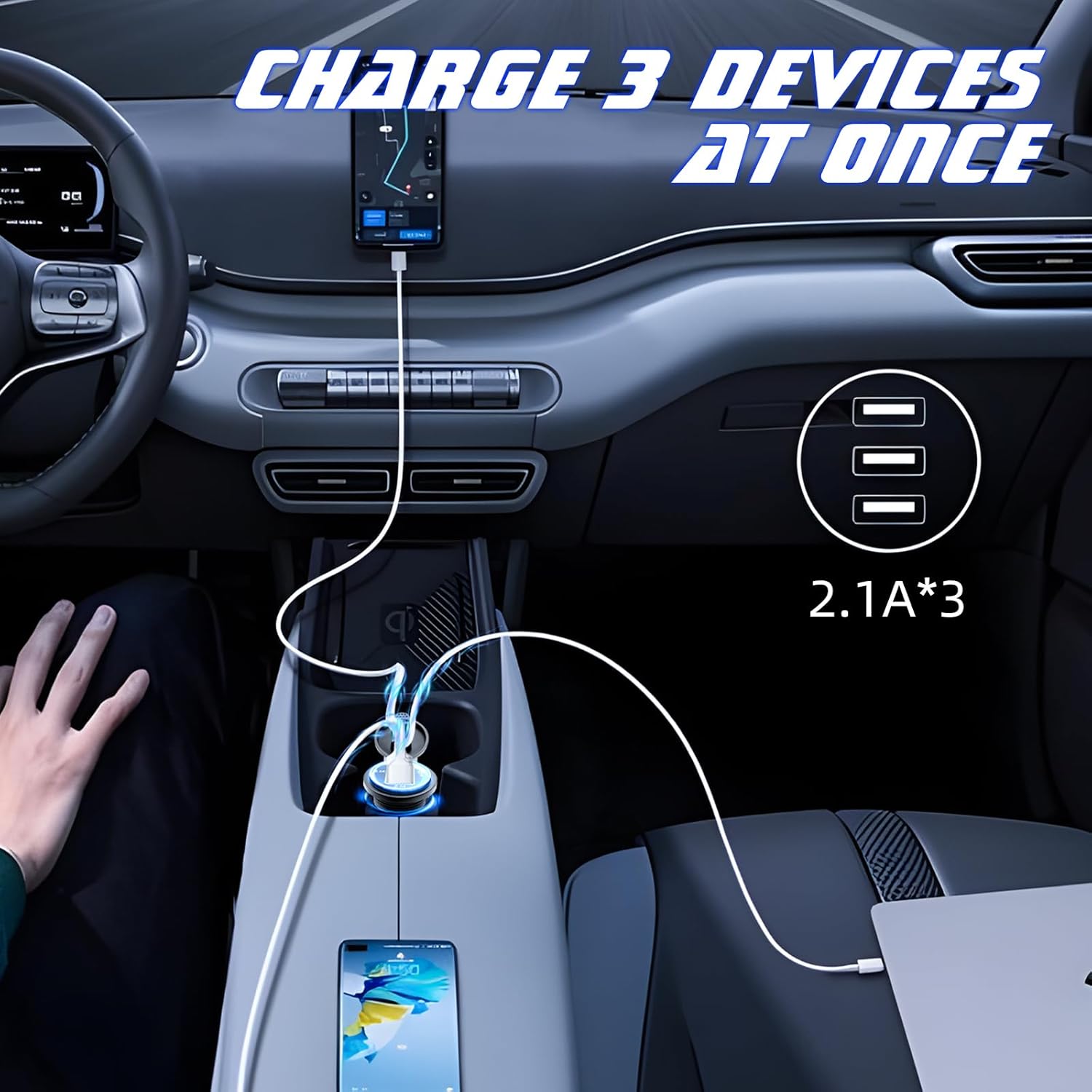 3 USB Ports Design: Equipped with three USB ports, each rated at 2.1A, this charger allows you to charge three devices simultaneously, providing optimal charging speed for all your gadgets.