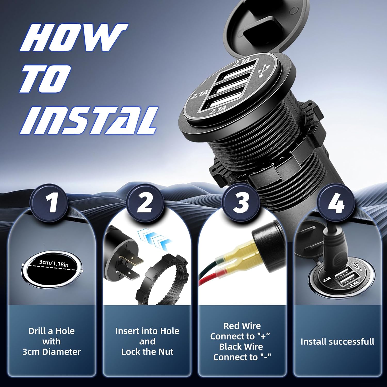 Simple Installation: Installation is quick and easy—just drill a 1.18-inch (3cm) round hole, insert the USB charger, tighten the screw, and connect the positive and negative terminals for a hassle-free setup.