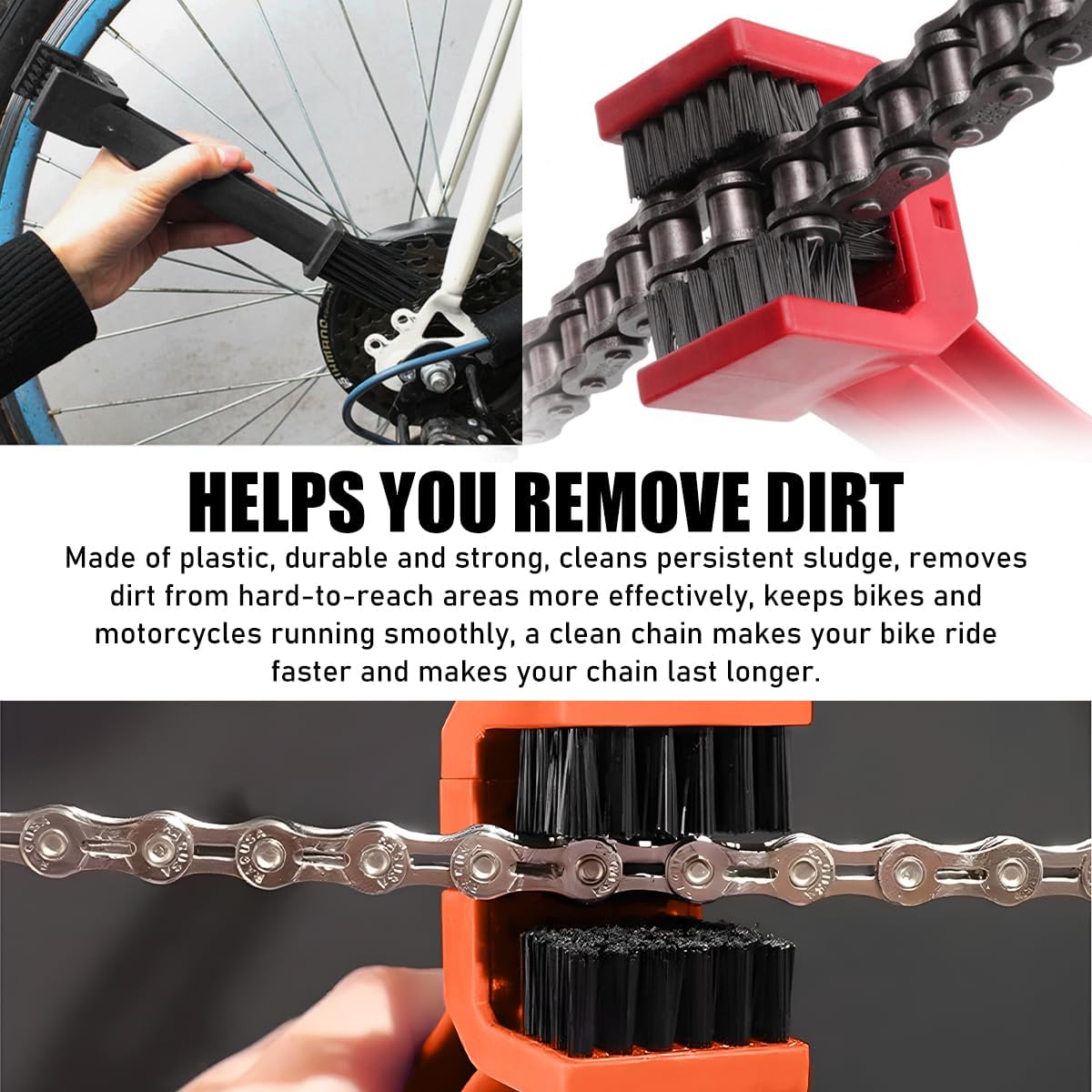 Quality Materials: This chain cleaning brush is made of high quality wear-resistant PP material. This material is abrasion and scratch resistant, and it maintains its good performance even after long-term use. And it is weather resistant and can be kept intact in any weather