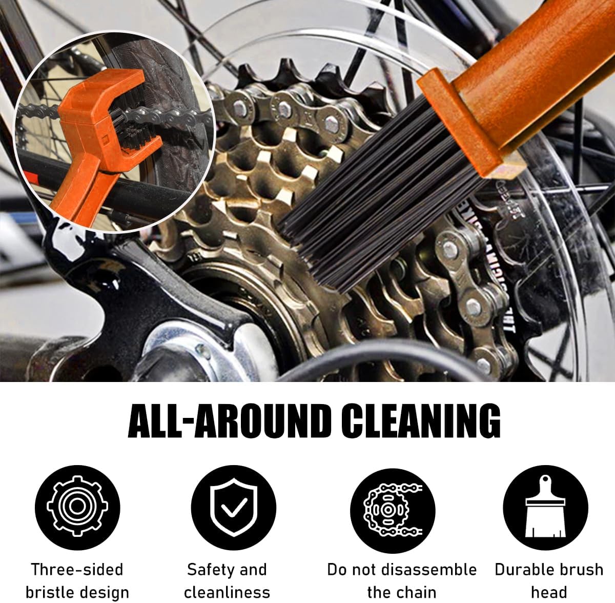All Around Cleaning: Our products come with dual brush heads, one long and one short designed to provide all-around cleaning. The long brush head is used to clean wheels, gearboxes, pedals and brakes, while the short brush head is used to clean chain grooves and hard-to-reach areas