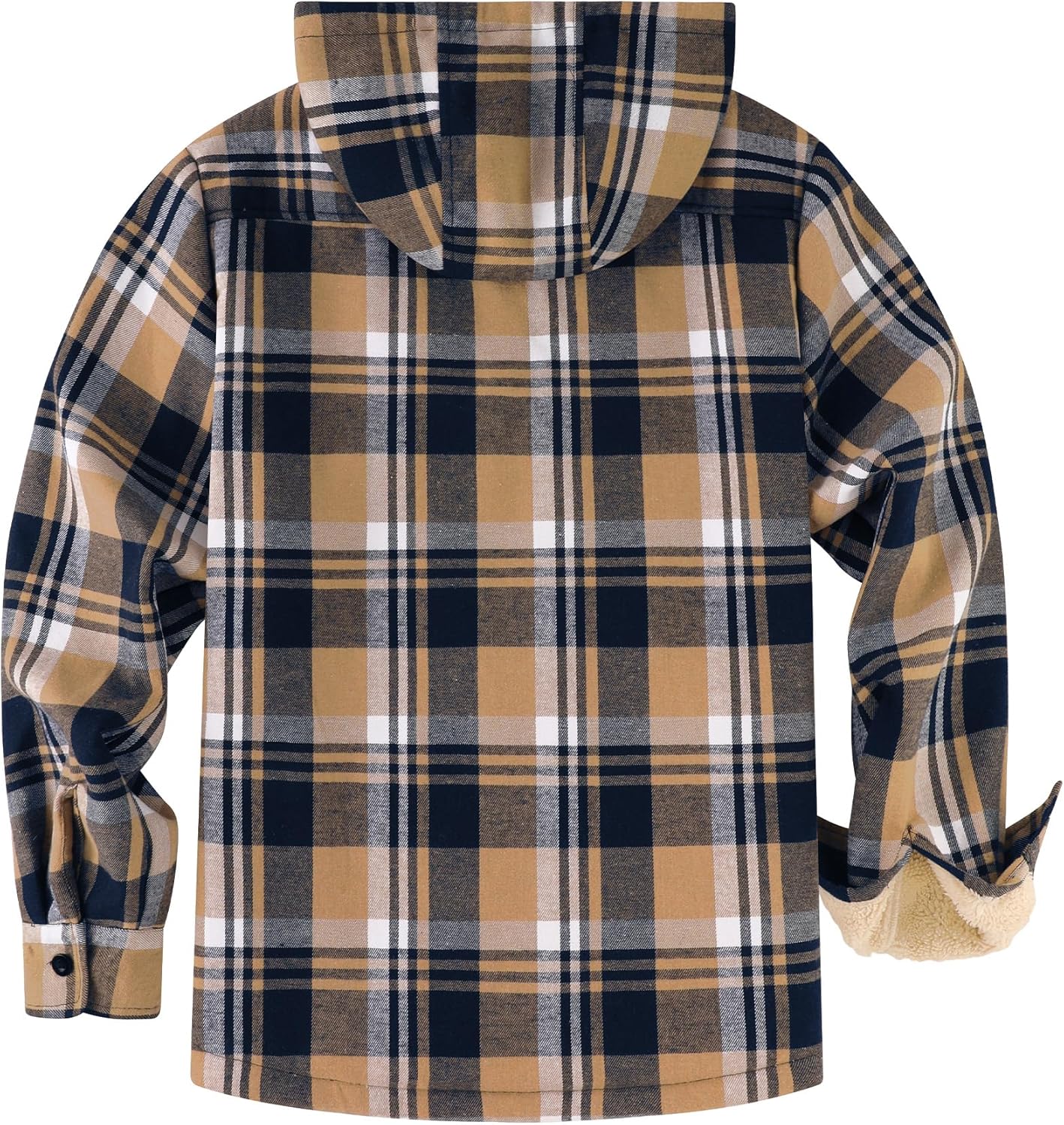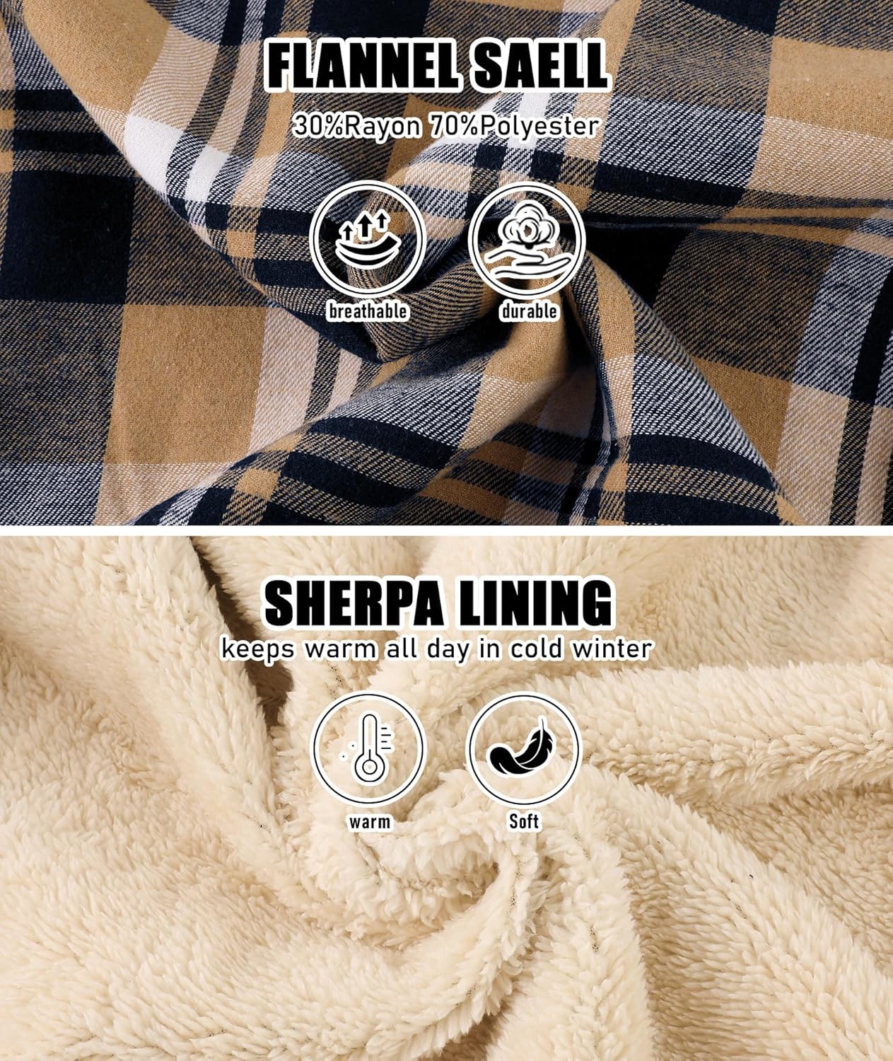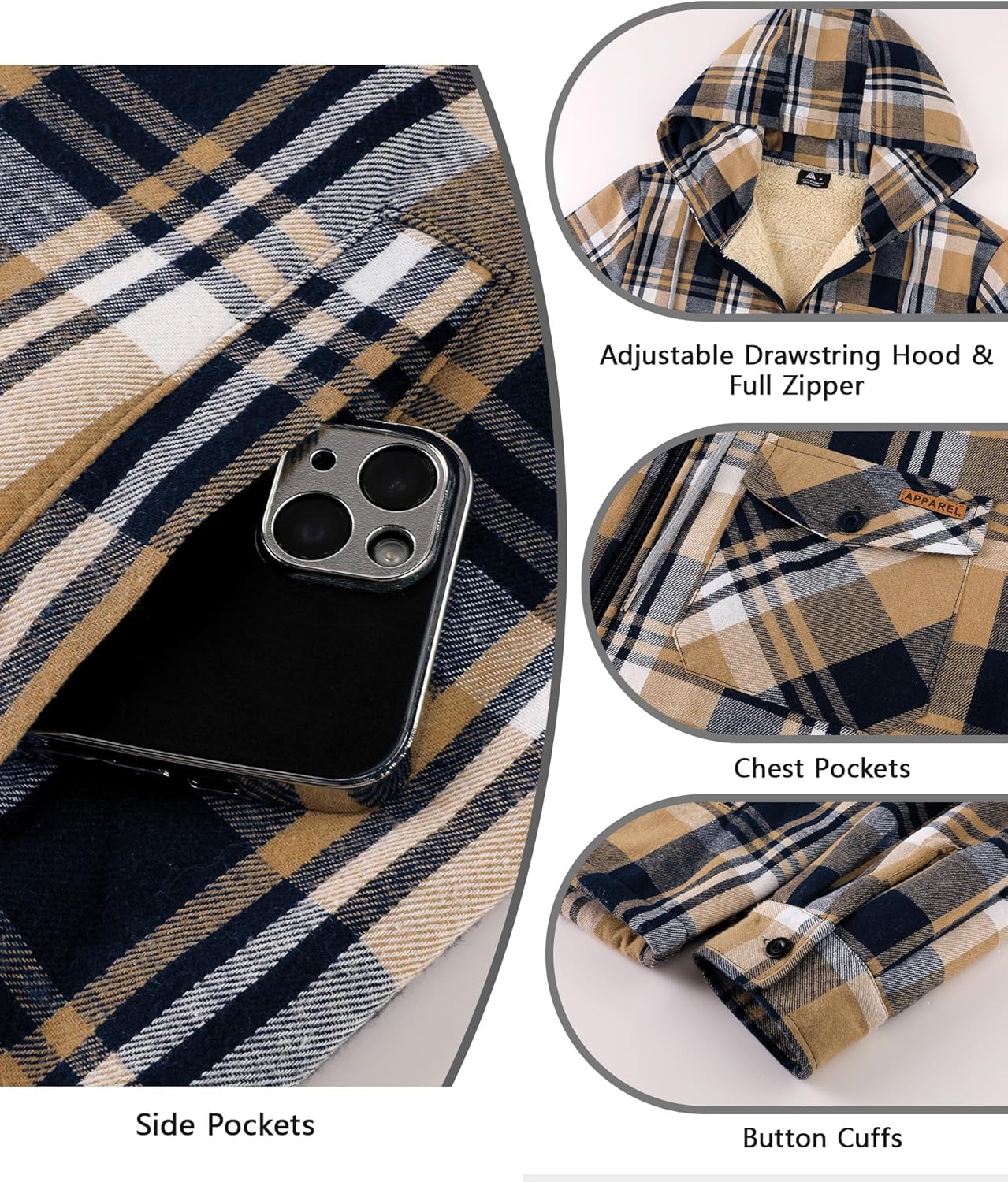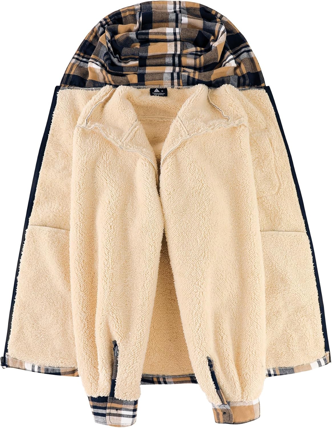 FEATURES: The flannel jacket design includes one chest pocket, two side pockets, two inner pockets and a stylish leather badge on the chest pocket. The hood features an adjustable drawstring and is designed with a double-layer plaid texture. Mens fleece jacket has a full-zip design for easy on-and-off, and the sherpa lining provides extra warmth