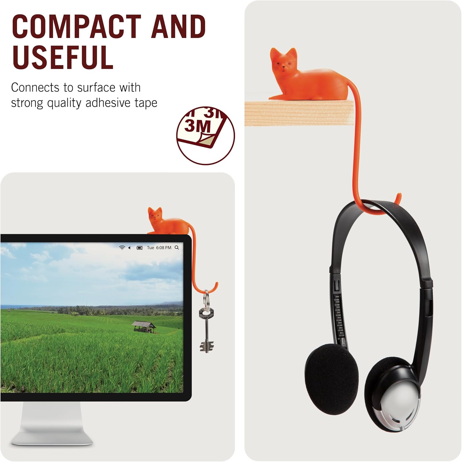 THIS LITTLE KITTY STAYS HOME - Ginger the Cat Tail Hook is a wonderful new way to hang and hold your keys, glasses, and cords, or serve as a headphones hook, and other items. Ginger will happily adhere to one spot. She comes with 3M double-sided tape to stick to any flat surface.