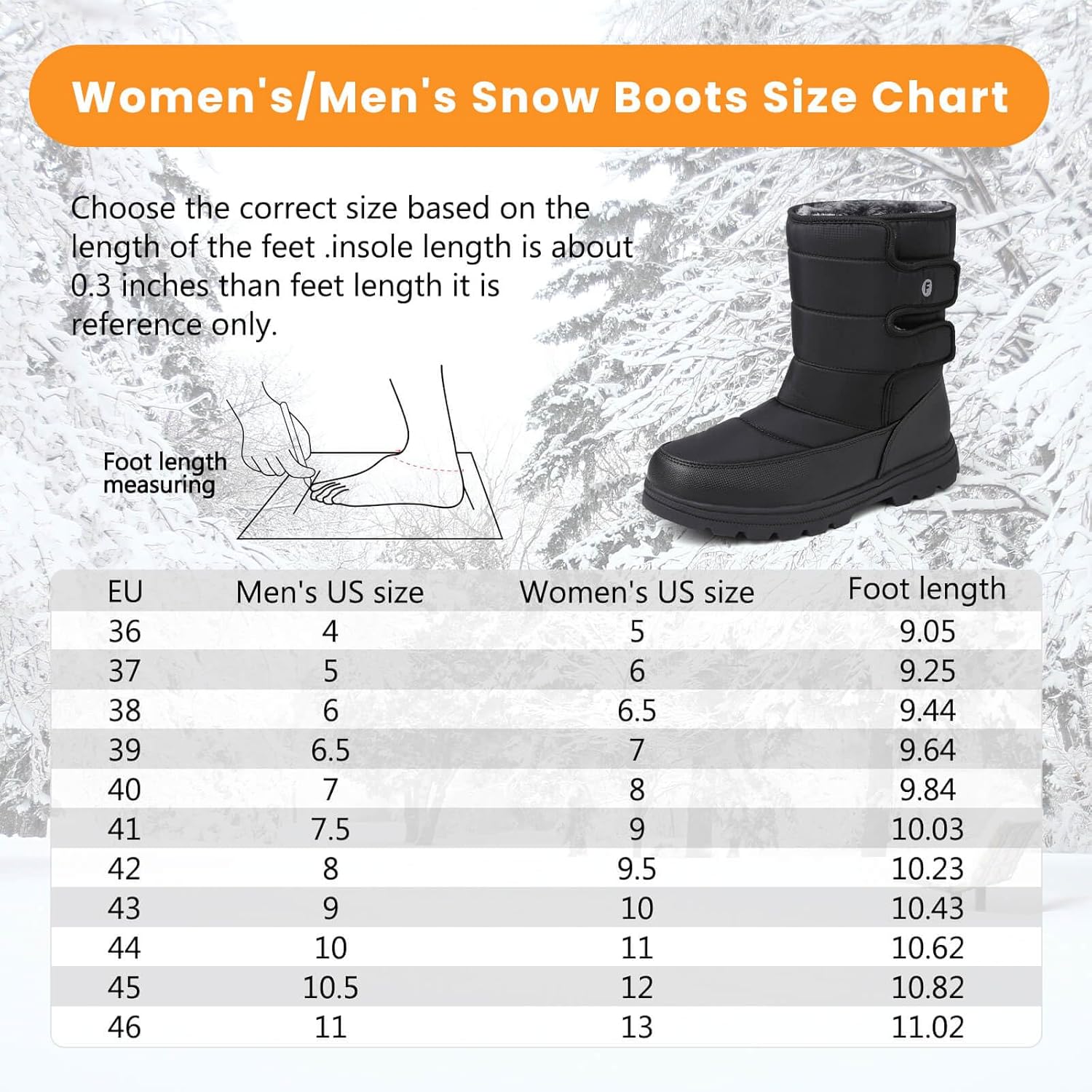 Easy On & Off with Secure Fit:These womens snow boots feature adjustable hook-and-loop straps for a snug, customized fit and quick on/off — ideal for both men and women on the move.