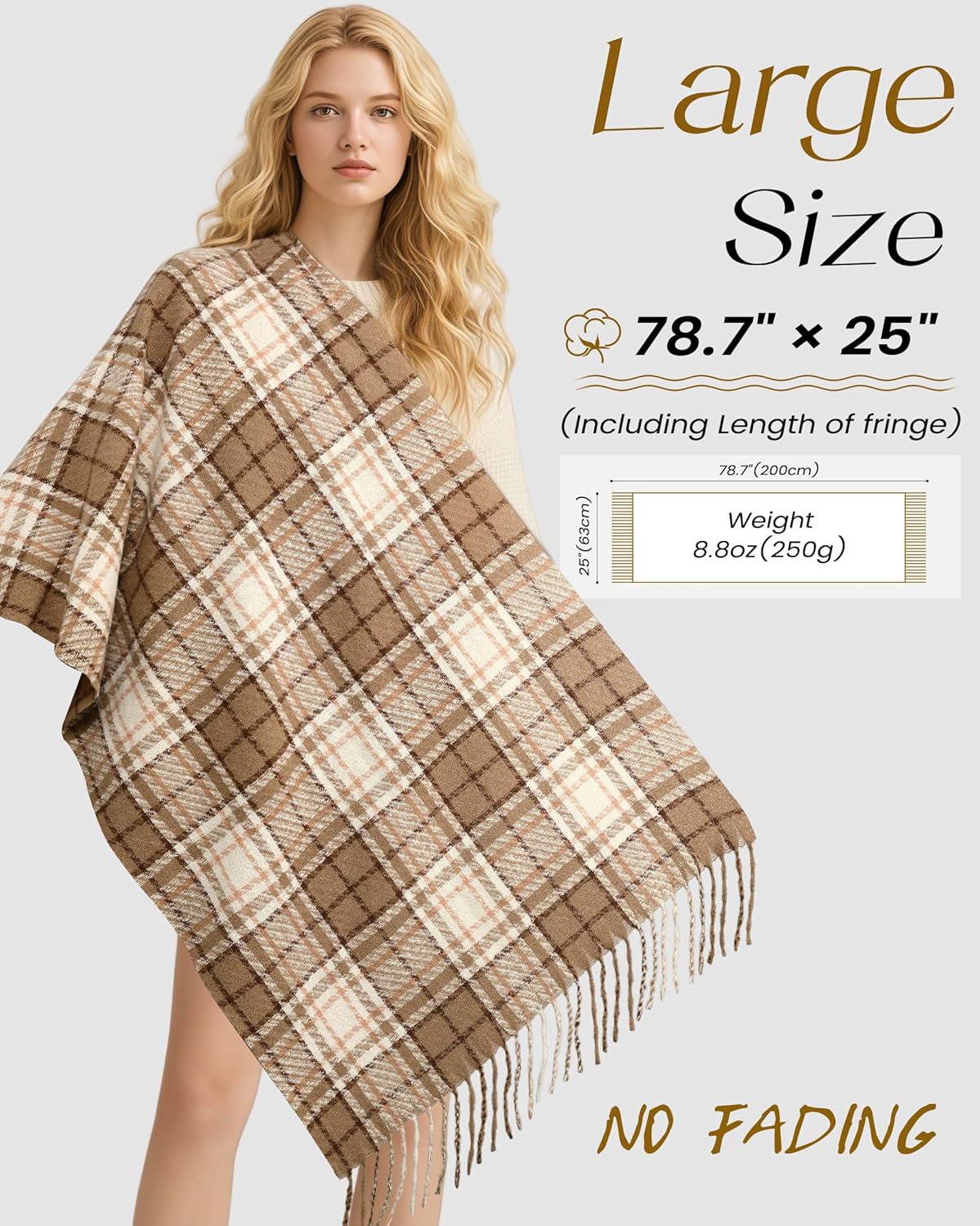 Scarf Size: Our plaid scarf measures approximately 78.7 inch length and 25 inch wide, include the tassel;This cashmere stole can be worn as a scarf, a wrap, or a cape depending on how you style it, there is no limit to use it