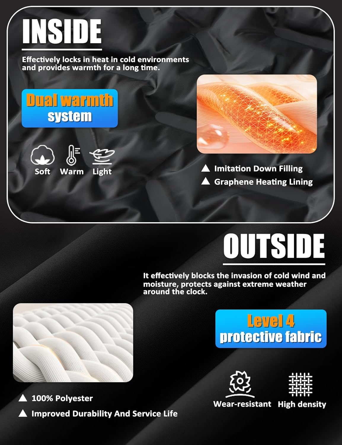 Upgraded Warmth Material: This men’s winter coat with hood features ultra-lightweight down-alternative insulation and a graphene thermal lining for outstanding warmth. It efficiently conducts and retains heat for long-lasting insulation without feeling bulky, making it great for cold and windy conditions.
