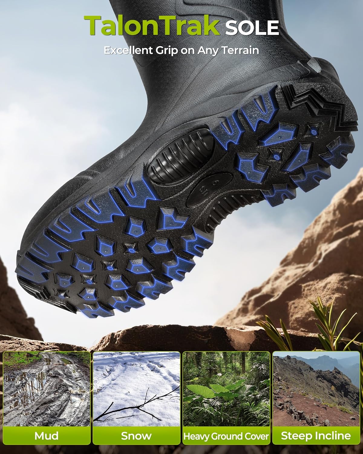 Superior Traction on All Terrain – The exclusive TalonTrak anti-slip outsole features aggressive deep lugs that grip in mud, snow, and slick surfaces. Perfect for swampy marsh hunts, cold weather treks, or wet farm work, these all-terrain boots keep you stable and secure on every adventure.