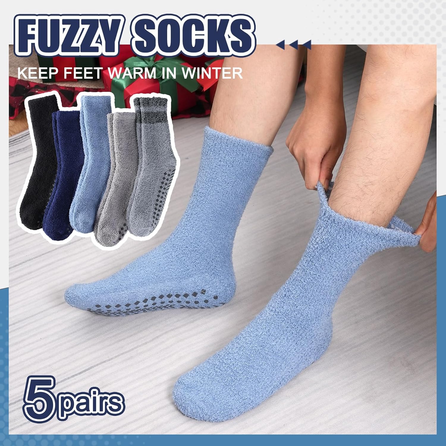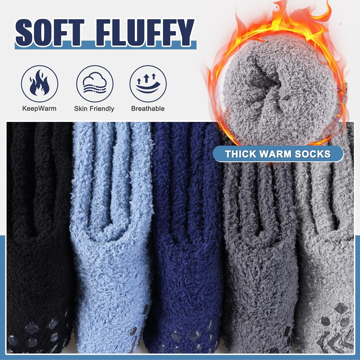 floconssy Fuzzy Socks Men with Grips, Cozy Fluffy Elderly Slipper Sock Non Slip Thick Winter Warm Hospital Sleep Home 5 Pairs