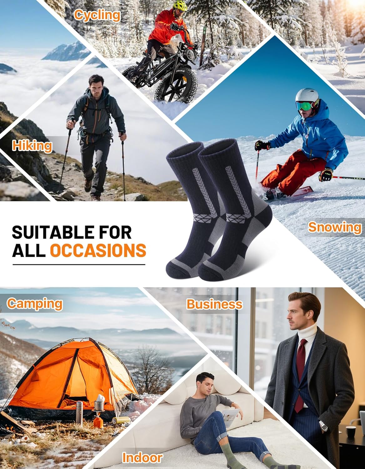 More Awesome Features? Smart Details, Smarter Performance. Thermal socks shock-absorbing ankle stripes prevent blisters. Wool socks for mens features cushioned soles absorbs shock during long hikes, non-slip elastic cuffs, reinforced toe/heel ensure long-lasting durability for all-day comfort. Arch support technology reduces foot fatigue by 40%. Strategic cushioning zones absorb impact at heels/toes, while seamless toe stitching eliminates friction points