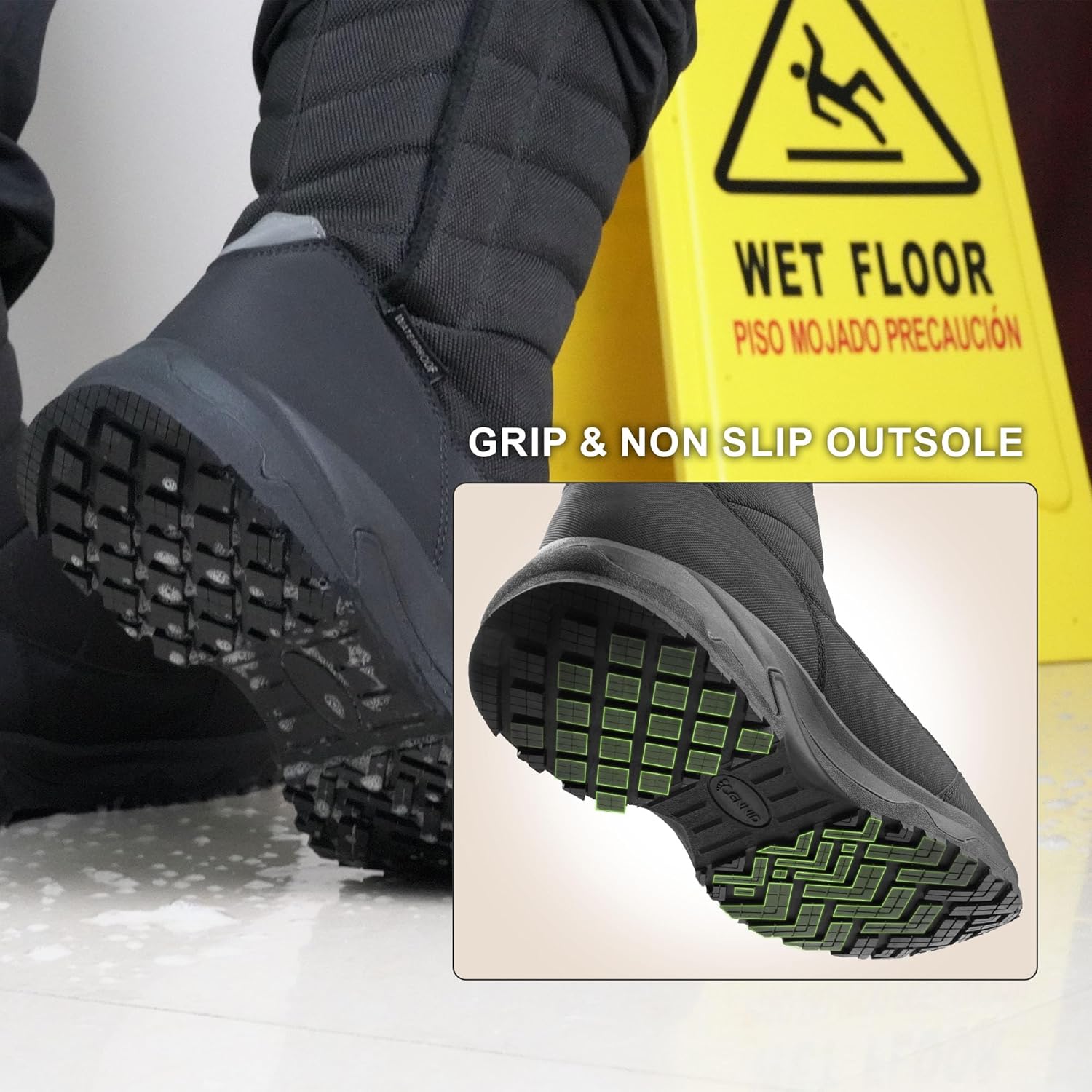 Non-Slip Sole: Designed for walking and standing occupations, the sole grips reliably in slippery environments—from snowy terrain to wet surfaces—ensuring safe, stable standing even when snow turns slick underfoot.